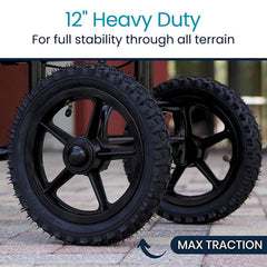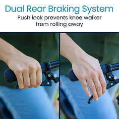 Four, 12-inch pneumatic wheels provide an exceptionally stable base for easy maneuverability on any surface, including carpet, gravel, grass, dirt and pavement. The knee walker also utilizes dual rear disk brakes to provide superior stability and control on uneven surfaces and gentle inclines.