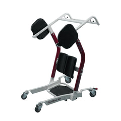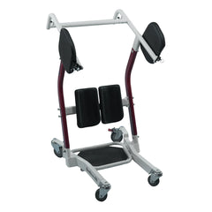 The Standing Transfer Aid is a convenient toileting alternative to a wheelchair. The lift is rolled up to the patient so their knees touch the padded knee support and the open seat is lowered behind the patient.
