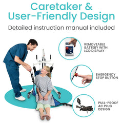 The Vive Electric Patient Lift is built with your safety in mind, incorporating an emergency stop feature, gradual acceleration and deceleration controls for lift movements, and a durable design that prevents accidental unplugging. These features collectively enhance both the patient’s and caregiver’s sense of security during transfers